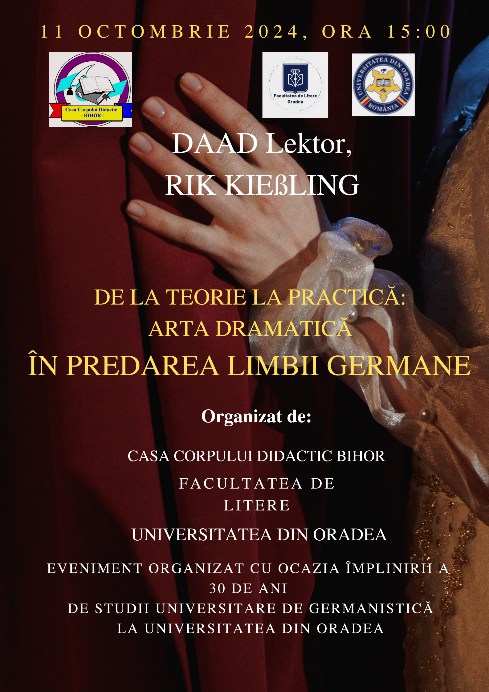 ֎ 11.10.2024 Workshop De la teorie la practică: Metode ale pedagogiei artei dramatice în predarea limbii germane - ora 15:00, sala C003  AFIS